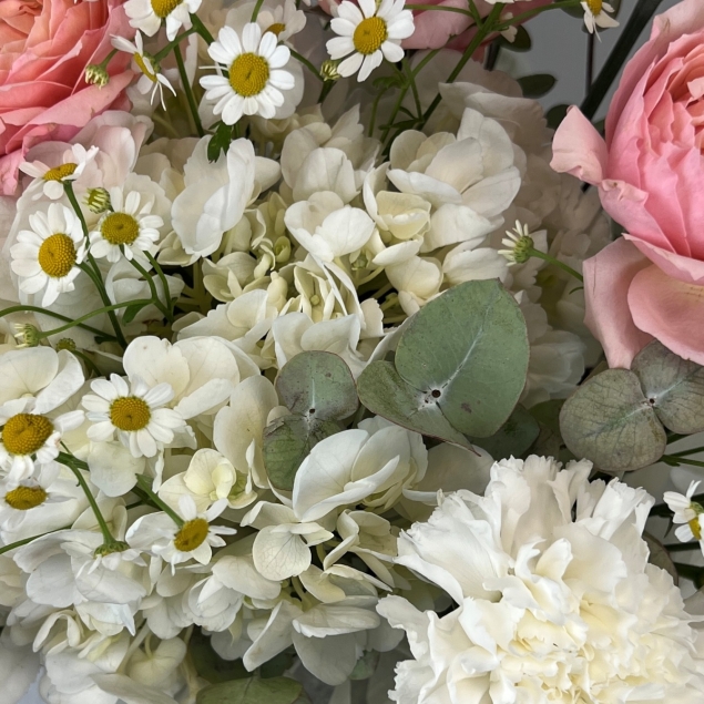 Эвкалипт Цинерея - 0.2 пуч., лента - 1 шт., упаковка пленка - 2 шт., гвоздика одноголовая - 3 шт., роза кантри блюз - 4 шт., роза розовая - 5 шт., эустома розовая - 2 шт.