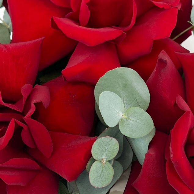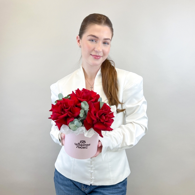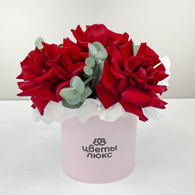 Каждая роза раскрывается мягким, глубоким оттенком красного, символизируя любовь, уважение и внимание. Эвкалипт цинерея придаёт композиции свежесть, лёгкость и утончённость, делая её гармоничной и выразительной. Шляпная коробка превращает букет в законченный и стильный подарок, который хранит эмоции и дарит радость.