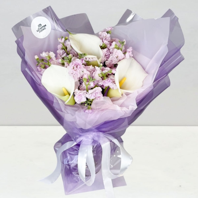 Гармоничный и нежный букет собран из белых калл и ароматной маттиолы. Такой уточненный букет порадует вашу любимую приятным ароматом и хорошей вазостойкостью. Очень нежный букет, который идеально подойдёт для романтической встречи!
