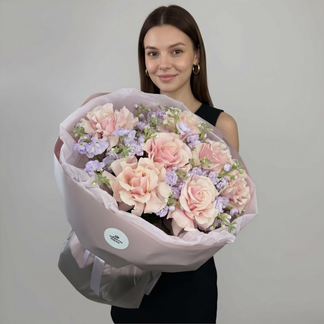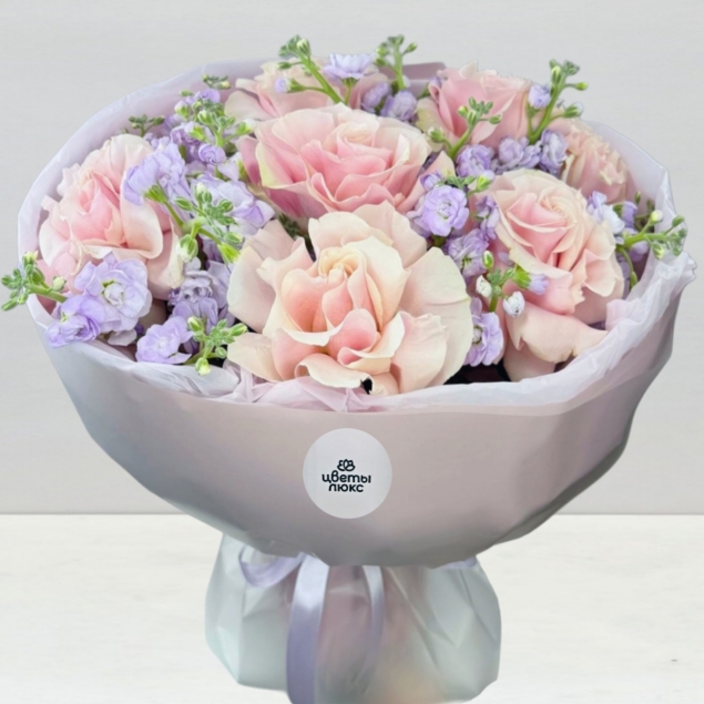 Гармоничный и нежный букет собран из пудровой розы и ароматной маттиолы. Такой уточненный букет порадует вашу любимую приятным ароматом и хорошей вазостойкостью. Очень нежный букет, который идеально подойдёт для романтической встречи!