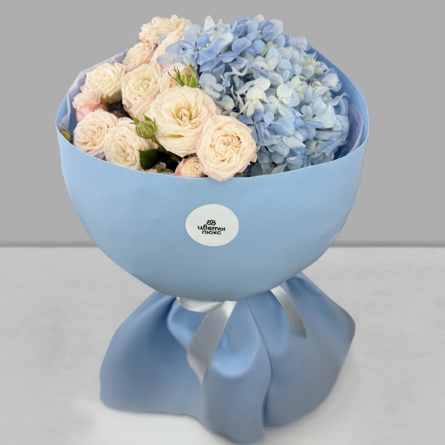 Воздушный голубой букет с гортензией и пиановидной розой. Такой яркий и нежный одновременно.