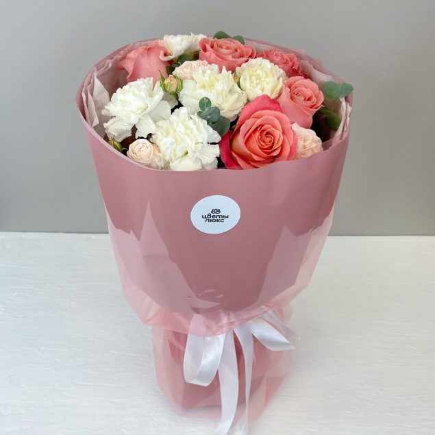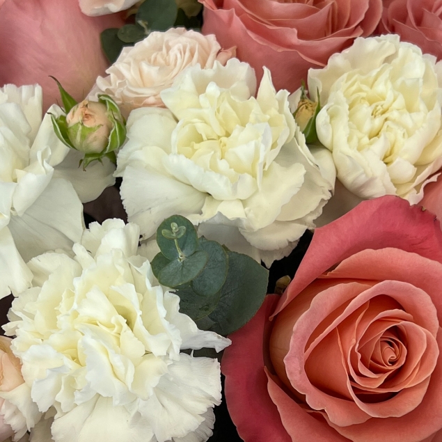 Утончённая композиция из розовых роз, кремовой пионовидной кустовой розы и нежных гвоздик, дополненная эвкалиптом цинерея. Букет, наполненный теплом, заботой и светлыми чувствами.