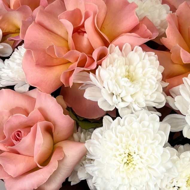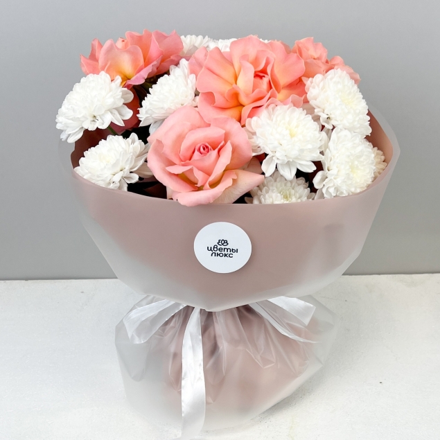 Гармоничный и чудесный букет собран из кенийской розы и хризантемы. Розочка высотой 40см, с аккуратными бутончиками порадует вашу любимую приятным ароматом и хорошей вазостойкостью. Очень нежный сорт и цвет розы - идеальное сочетание для романтической встречи!