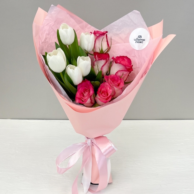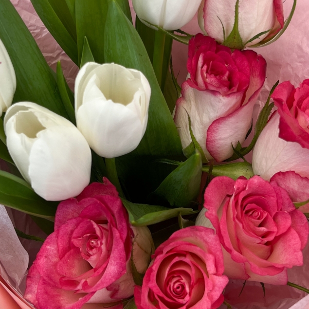 Букет «Моему ангелу» — это нежное признание в самых светлых и искренних чувствах, отражённое в его трогательном названии. В композиции гармонично переплетаются 5 белых тюльпанов и 6 розовых роз высотой 40 см: белые тюльпаны символизируют чистоту, искренность и трепетную заботу, а розовые розы придают букету мягкость, романтичность и тепло. Контраст белоснежных лепестков и нежно-розовых оттенков создаёт утончённый и воздушный ансамбль, который выглядит элегантно и по-настоящему душевно. Стройные розы 40 см добавляют композиции выразительности, а тюльпаны наполняют её лёгкостью и свежестью. Букет аккуратно оформлен в стильную упаковку и перевязан лентой, что подчёркивает его изящество и завершённость. «Моему ангелу» — идеальный подарок для той, кто вдохновляет, окрыляет и делает каждый день особенным.