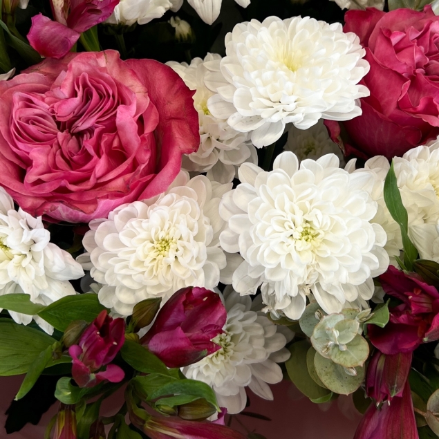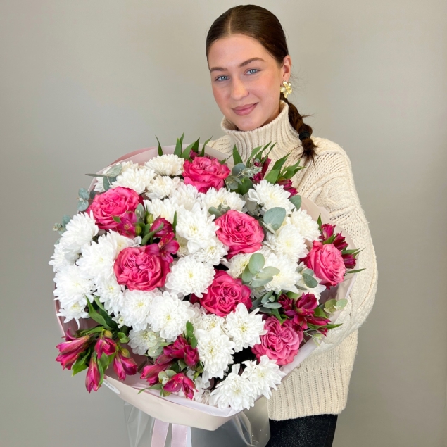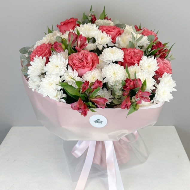 Букет "Малиновый джем" из хризантем, роз и альстромерий