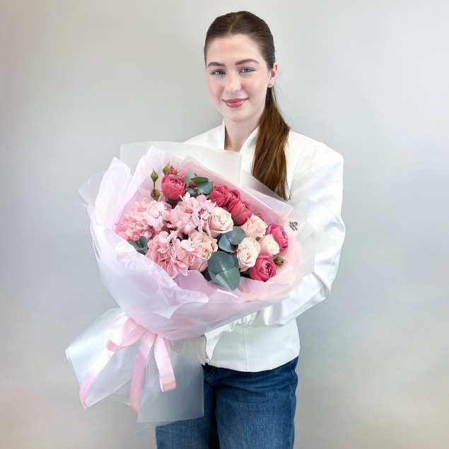 Нежная гармония пудровых оттенков и бархатной текстуры — букет из кустовой пионовидной розы, пудровой розы Эквадор и розовой гортензии, украшенный эвкалиптом цинерея. Каждая деталь композиции наполнена мягкостью, светом и изысканностью.