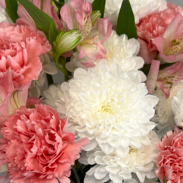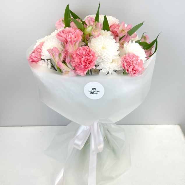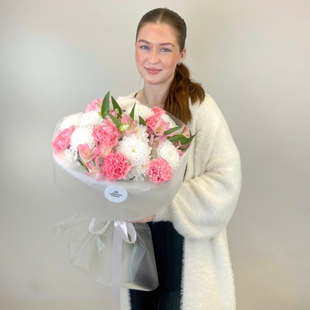 Букет "Сказочный лес" переносит в мир магии. Нежные розовые диантусы, белоснежные хризантемы и нежная розовая Альстромерия - это стойкий букет и чудесный подарок, который подарит улыбку.