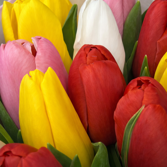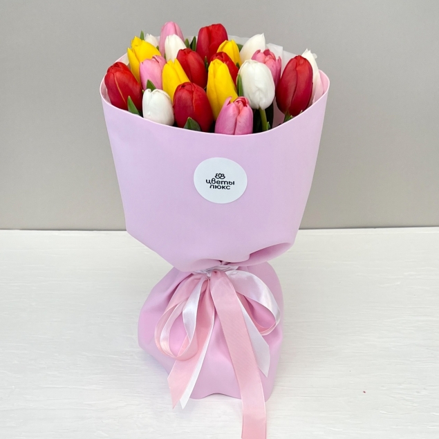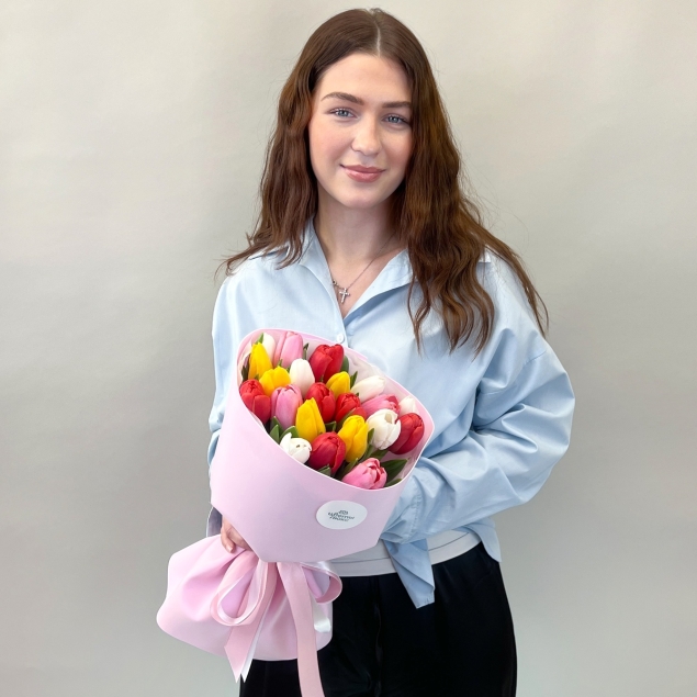 Букет «Монпансье» — это яркая палитра эмоций, словно россыпь разноцветных леденцов, собранных в изящную весеннюю композицию. В его составе — 21 тюльпан микс: 6 белых, 5 жёлтых, 6 красных и 4 розовых, гармонично объединённых в живой и выразительный ансамбль. Белые тюльпаны придают букету свежесть и лёгкость, жёлтые наполняют его солнечным настроением, красные добавляют страсть и глубину чувств, а розовые вносят нежность и романтичные нотки. Такое сочетание оттенков создаёт динамичную, но при этом сбалансированную композицию, которая притягивает взгляд и дарит ощущение праздника. Стройные силуэты тюльпанов и бархатистые лепестки формируют объёмный и воздушный образ. «Монпансье» — идеальный подарок для тех, кто хочет порадовать близкого человека яркими красками, теплом и искренними эмоциями.