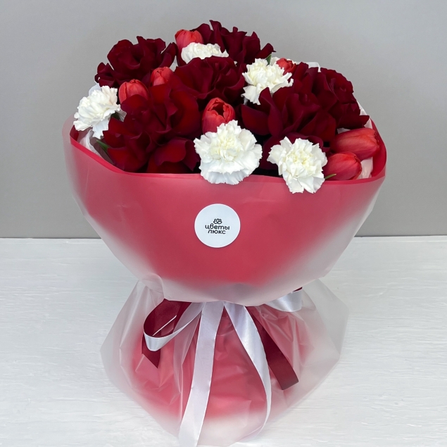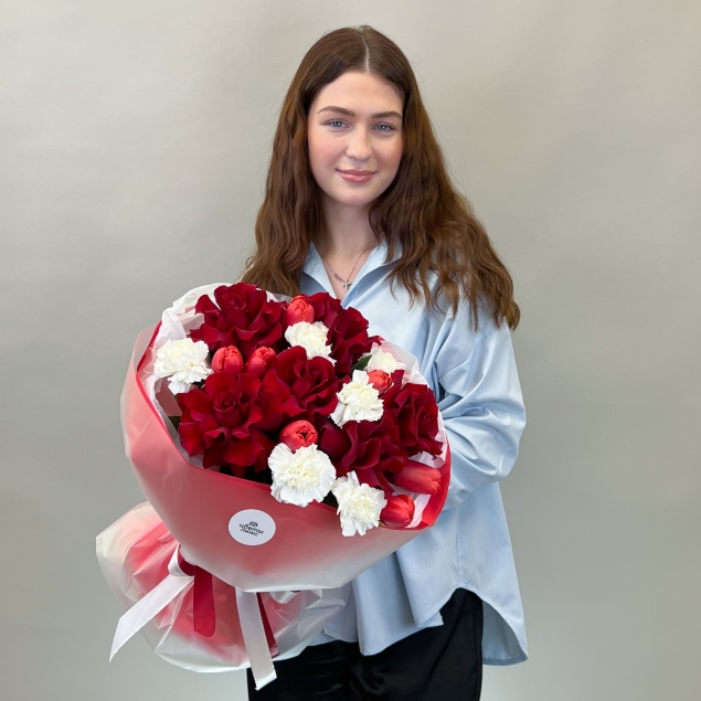 Нежный ароматный букет из тюльпанов, милых ромашек и изящных французских роз поднимет настроение даже в самый пасмурный день.