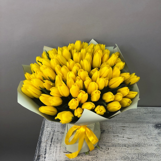 Поистине роскошный букет из 101 ярко-желтого тюльпана. Такой подарок заставит глаза блестеть от слез радости и счастья. Создан для тех, кто привык удивлять!