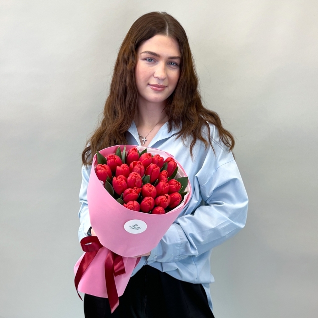Букет «Яркие огоньки» — это вспышка страсти и тёплых эмоций, собранная в эффектную и выразительную композицию. В его основе — 21 красный тюльпан, каждый из которых сияет насыщенным алым оттенком, словно маленькое пламя, символизирующее любовь, восхищение и искренние чувства. Бархатистые лепестки и стройные линии бутонов создают динамичный, гармоничный ансамбль, который притягивает взгляд и наполняет пространство энергией. Такое количество красных тюльпанов выглядит впечатляюще и становится ярким знаком внимания, говорящим о глубине эмоций. Пышная композиция смотрится торжественно и в то же время элегантно, подчёркивая значимость момента. «Яркие огоньки» — идеальный подарок для романтического признания и для тех случаев, когда хочется сказать о любви смело и красиво.