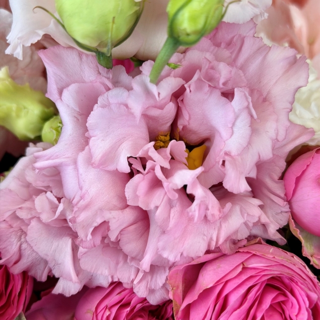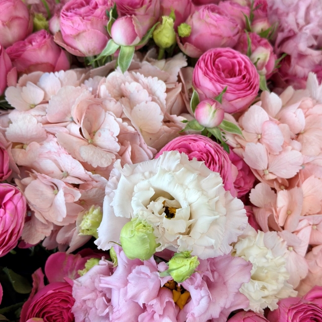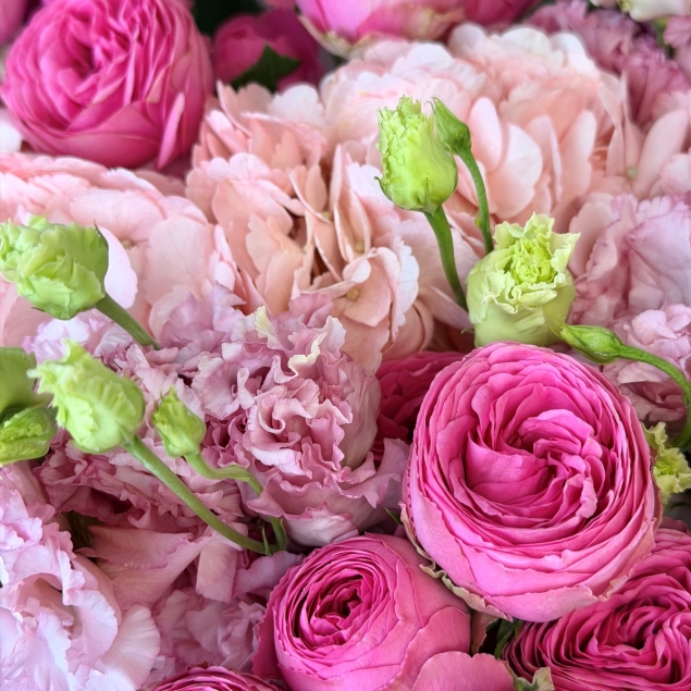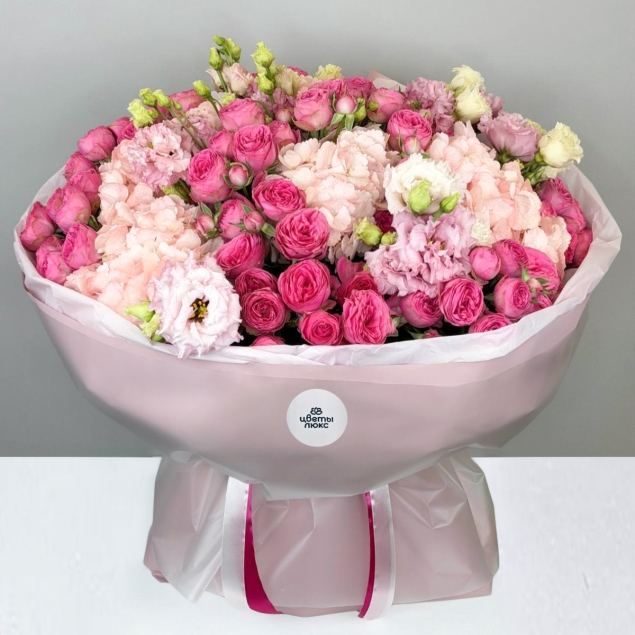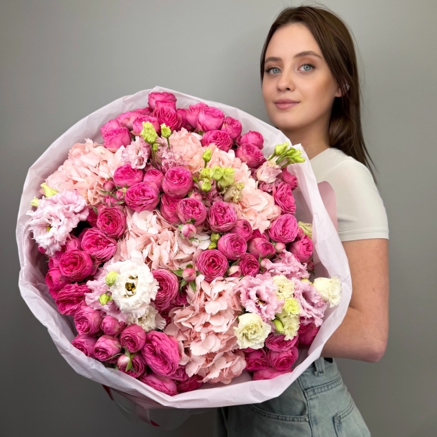 Яркий "вау" букет собран из кустовой пионовидной розы, насыщенного розового цвета, нежной эустомы и пушистых гортензий. Такой супер букет точно удивит свою обладательницу.