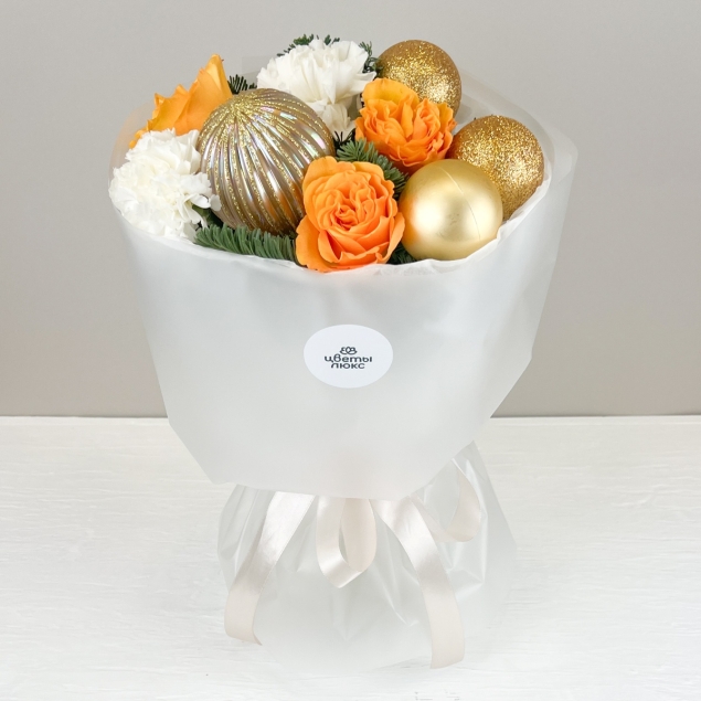Основу букета составляет пышная еловая ветвь, украшенная сверкающими шарами. Она словно приглашает окунуться в атмосферу зимнего волшебства, даря ощущение праздника и детской радости. Дополняют композицию яркие акценты в виде красных ягод, шишек и пышных еловых лап, создавая гармоничный и целостный образ.