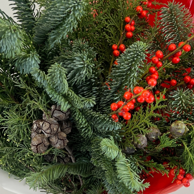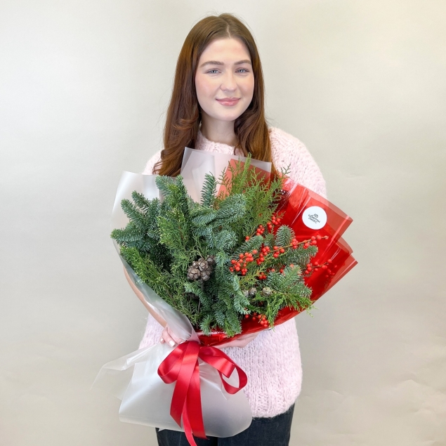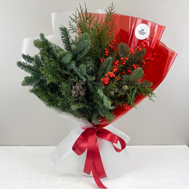 “Ягодный” новогодний букет — это символ зимних праздников и домашнего уюта. В его основе пышная елка, украшенная сочными ярко-красными ягодами и шишками.