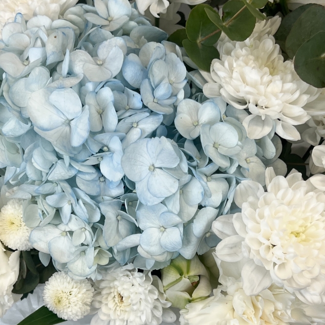 Эвкалипт Цинерея - 0.2 пуч., лента - 1 шт., упаковка пленка - 1 шт., гиперикум красный - 3 шт., гортензия - 1 шт., роза красная - 7 шт., эустома бел - 2 шт.