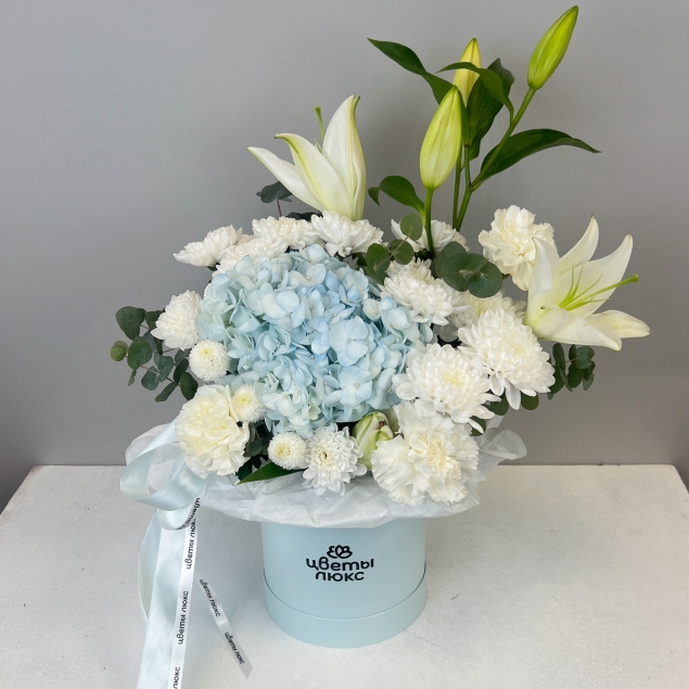Эвкалипт Цинерея - 0.2 пуч., коробка шляпная h14-d14 - 1 шт., лента - 1 шт., орхидея цимбидиум - 5 шт., лагурус - 0.1 пуч.