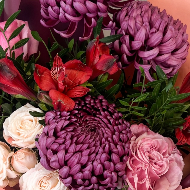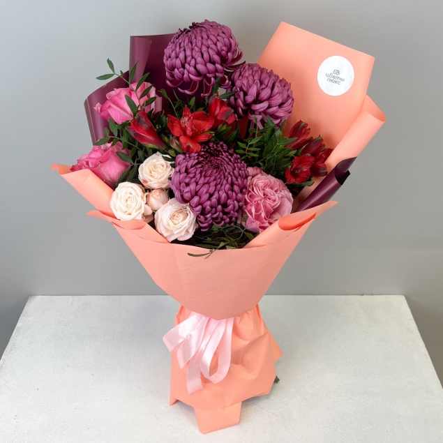 Упаковка пленка - 1 шт., альстромерия - 4 шт, роза розовая - 3 шт.